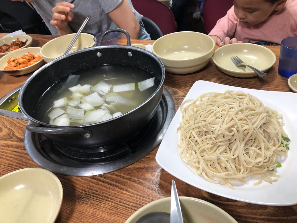 육수와 칼국수 면이 먼저 나오고요. 물이 끓으면 칼국수 면을 넣어 먹으라고 하더군요.