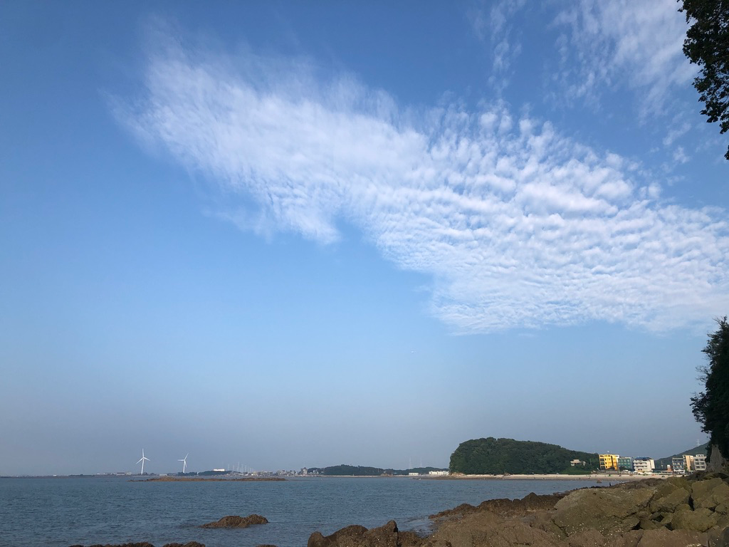 저녁 6시 정도 되니 바다에 길이 생깁니다? TV에서나 보던 썰물 때 바닷길이 열리는걸 직접 보다니 신기한 경험이었습니다. 자세히 보면 갈매기들이 바다 위에 앉아 있는데요. 썰물로 물이 빠져서 갯벌이 생겨서 먹이를 잡아먹으려고 앉아 있는 거 같네요.