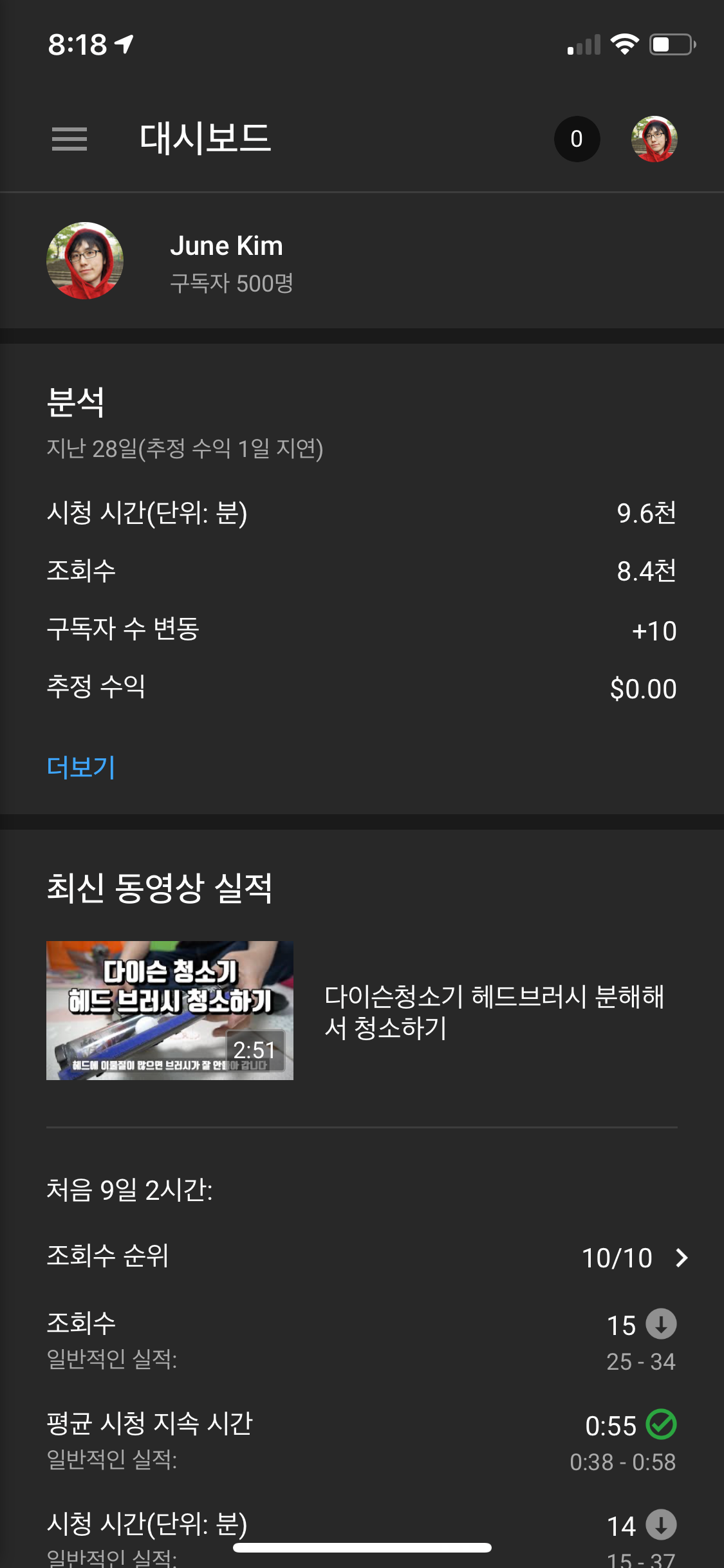 어제 드디어 제 유튜브 기본 채널 구독자가 500명을 돌파하였습니다.