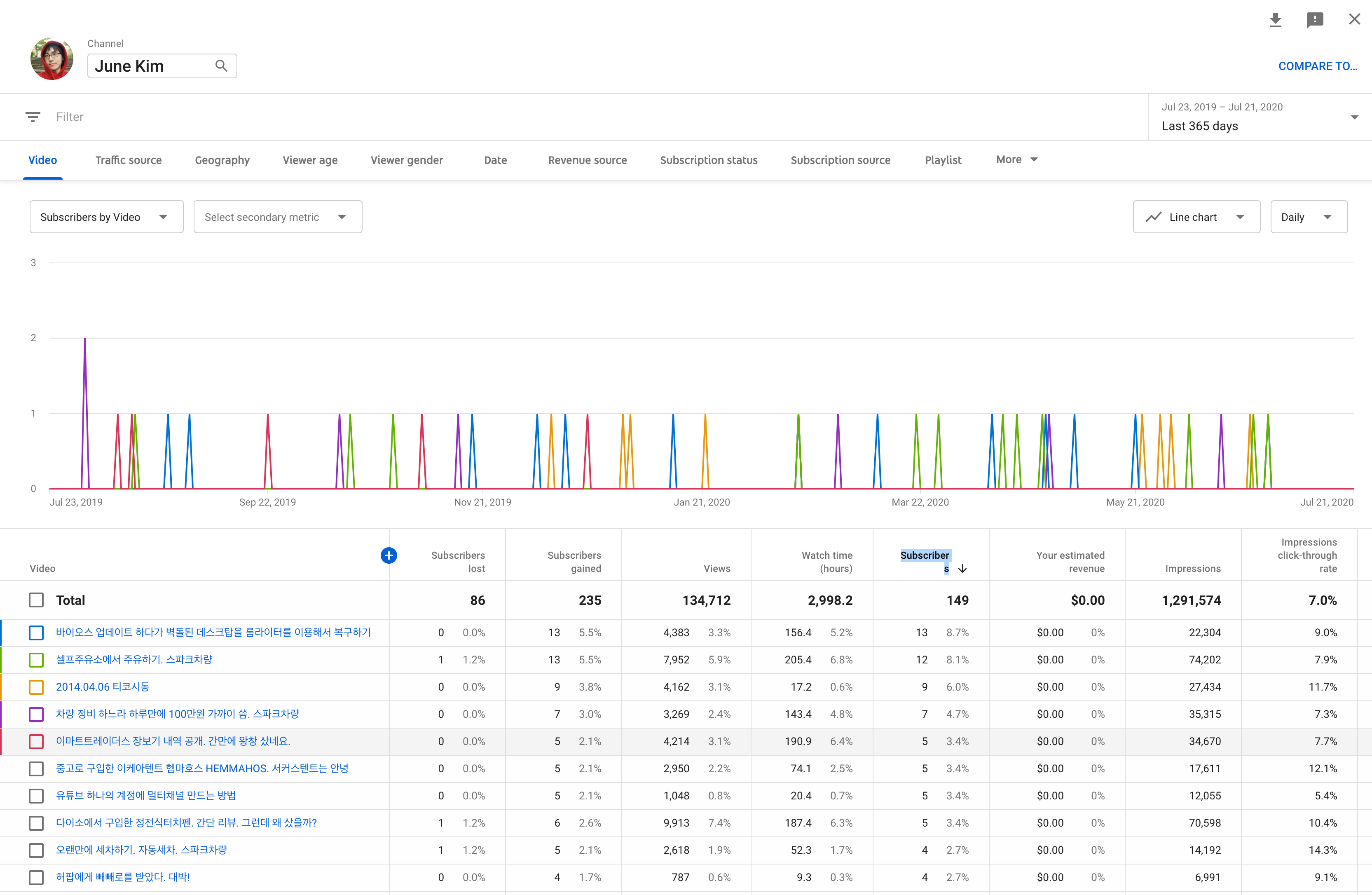 최근 1년간 어떤 영상에서 구독자가 생겼는지 확인해 보았습니다.