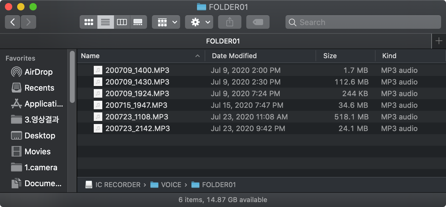 녹음파일은 YYMMDD_HHMM.MP3 규격으로 녹음됩니다. 200723_2142.MP3 파일은 2020년 7월 23일 21시 42분에 녹음한 파일이라고 볼 수 있습니다.