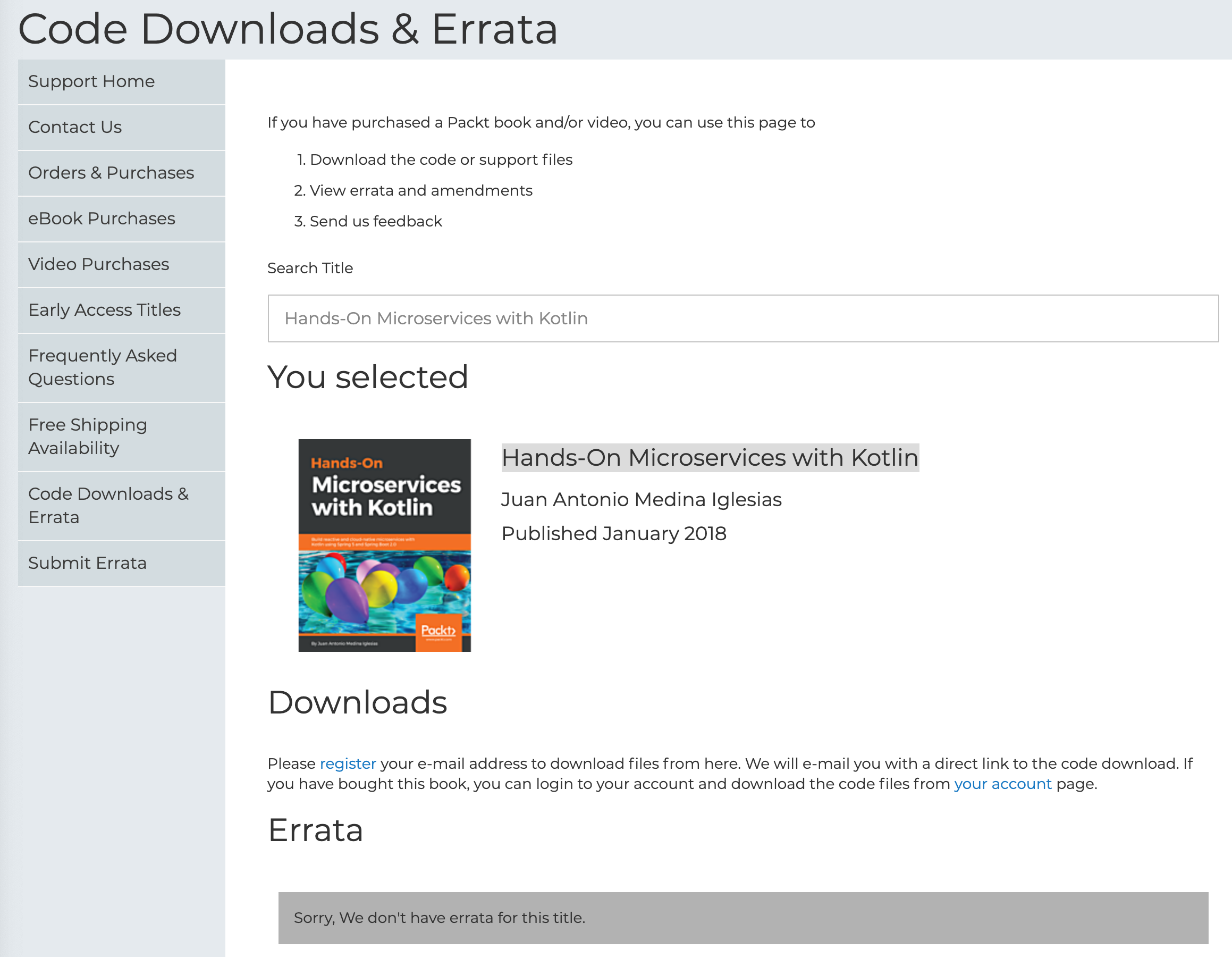 https://www.packtpub.com/support/code-downloads에서 원서 제목인 "Hands-On Microservices with Kotlin"를 검색하면 기 등록된 Errata를 확인할 수 있는 거 같은데요. 아직 하나도 등록된 게 없네요. 원서에는 정말 오타나 오류가 없으려나요?