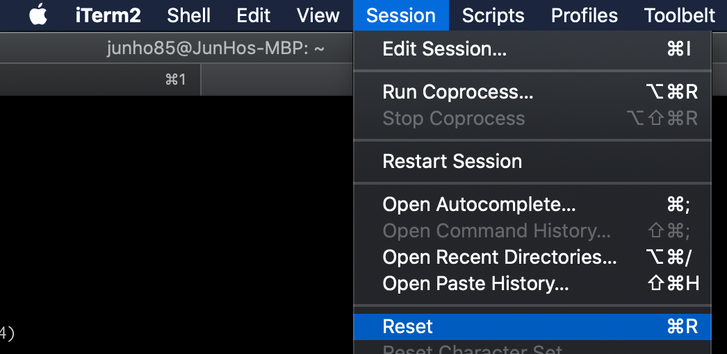 cmd+r 또는 터미널에서 직접 reset 명령어를 입력해 줘도 됩니다.