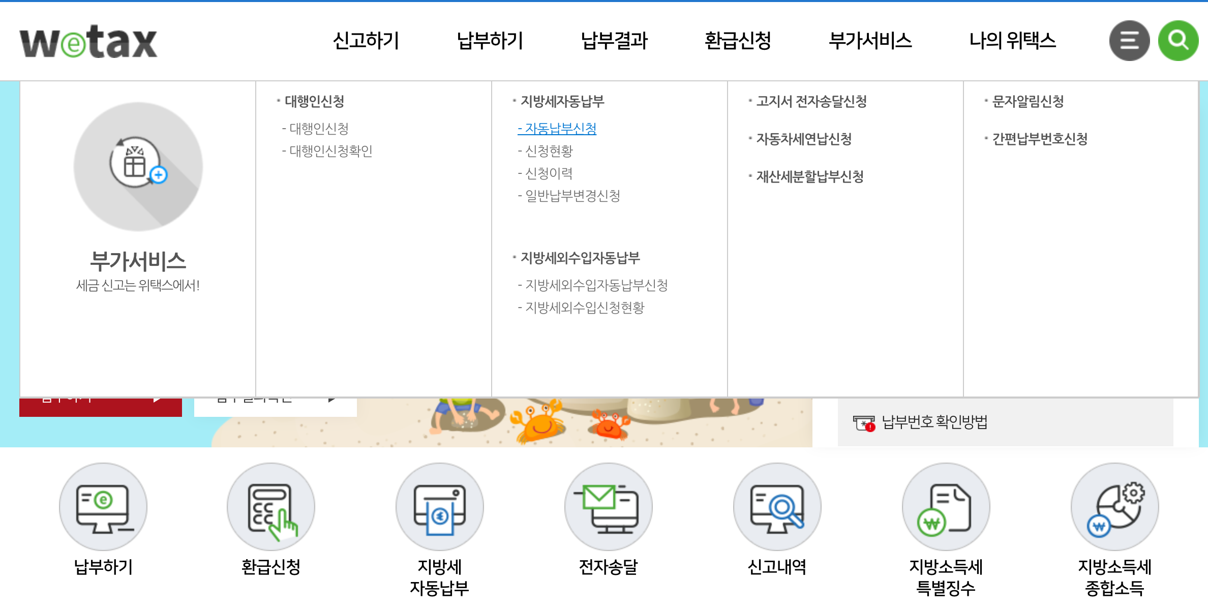 부가서비스 -> 지방세 자동납부 -> 자동납부 신청으로 들어갑니다.