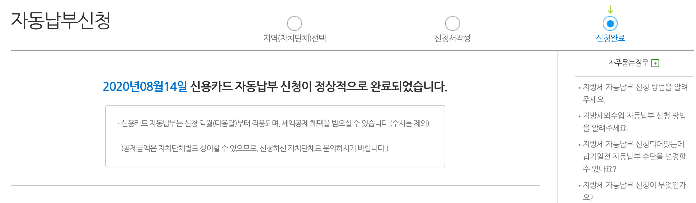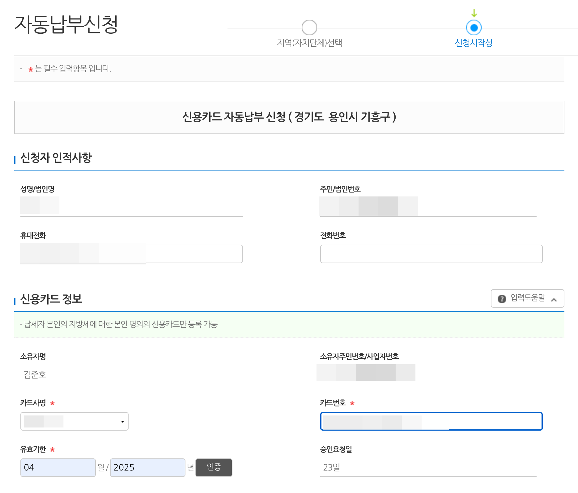 지역을 선택하고 저는 "신용카드 자동납부"로 선택했습니다. 계좌로 하면 잔고가 부족하면 실패할 거 같아 찜찜하네요.