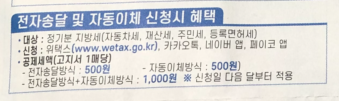 문득 뒷면을 넘겨 보니 전자송달 방식+자동이체방식을 하면 1000원을 공제해 준다는 내용이 보였습니다.