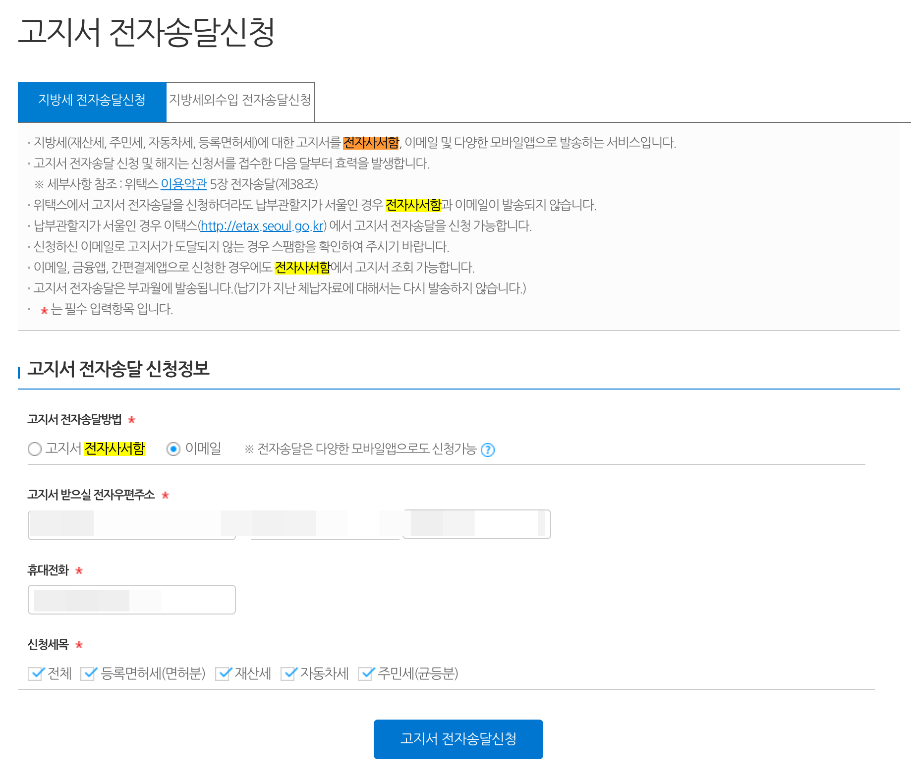 고지서 전달 송달 신청에 개인정보를 입력하고 "고지서 전자송달 신청"을 누릅니다.
