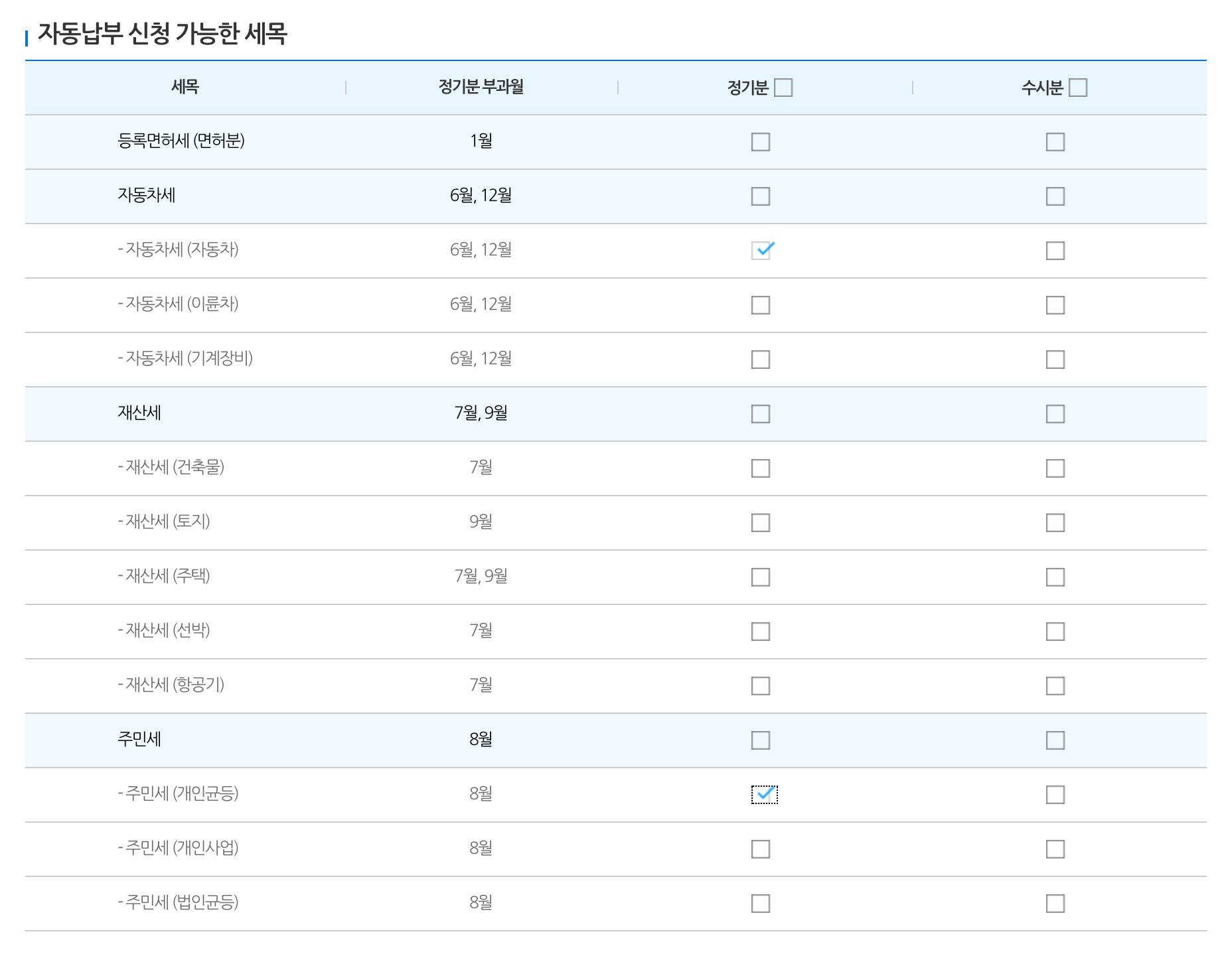 자동납부 신청 가능한 세목을 확인합니다. 뭔가 많은데 제가 내는 항목만 선택했습니다.