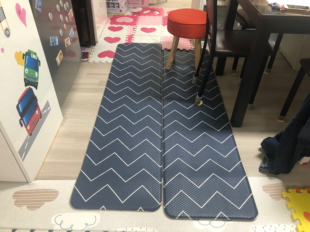 주방으로 들어가는 통로에도 퍼즐매트(EVA) 1cm 한 줄 더 빼고 주방 매트(PVC) 1.4cm로 교체했습니다. 여기 퍼즐 매트 청소하는 게 여간 까다로운 게 아니었는데 이제 좀 더 수월해질 거 같습니다. 폭신폭신하니 촉감도 더 좋고요. 그런데 사실 주방 매트는 보통 싱크대 앞에 깔아 쓰는 편인데 아직 싱크대 앞쪽에는 깔지 않았네요. 주방이 좁은 편이라 아마 깔리지도 않을 거 같긴 합니다.