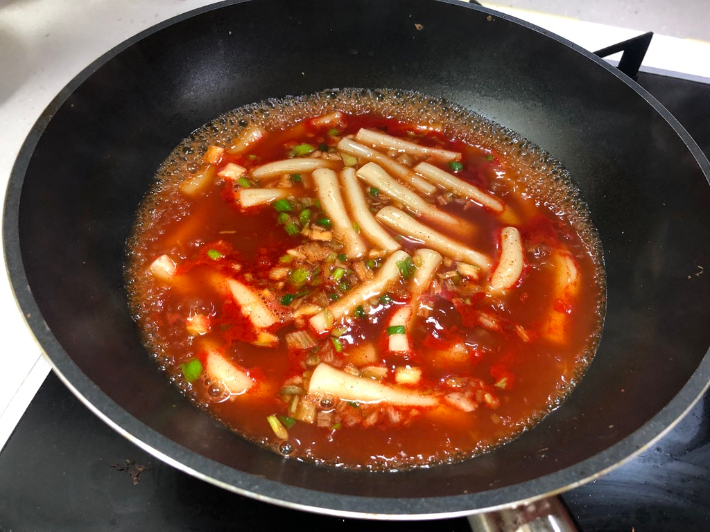 설명서에는 물 200ml 넣고 끓여서 떡 씻어 넣고 야채 후레이크랑 소스 넣어라 그랬던 거 같은데요. 저는 사진에는 없지만 멸치를 볶은 다음 물 300ml 넣고 끓여서 육수를 낸 다음 씻은 떡과 후레이크랑 소스를 넣었습니다.