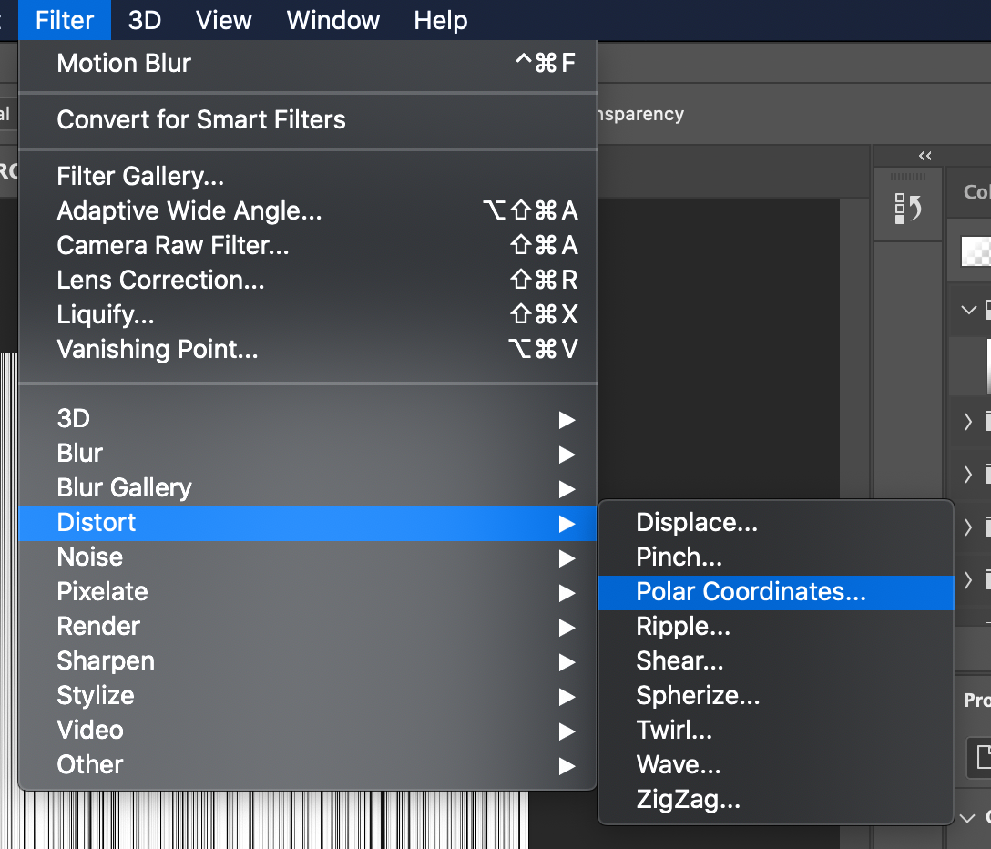 Filter -> Distort -> Polar Coordinates로 들어갑니다.