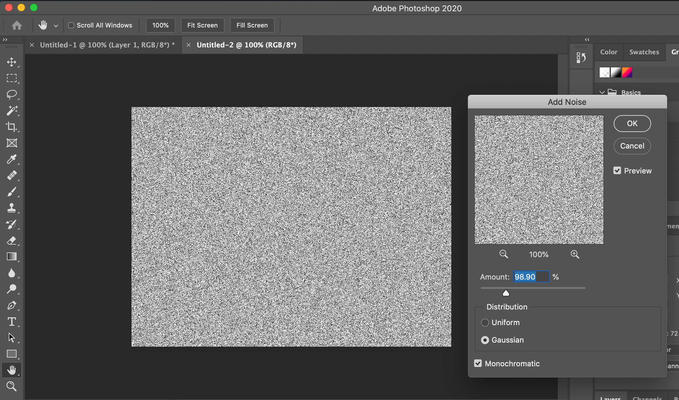 수치는 적당히 하면 되는데 Amount는 대략 100 가까이. Distribution은 Gaussian. 그리고 맨 아래에 있는 Monochromatic을 선택합니다.
