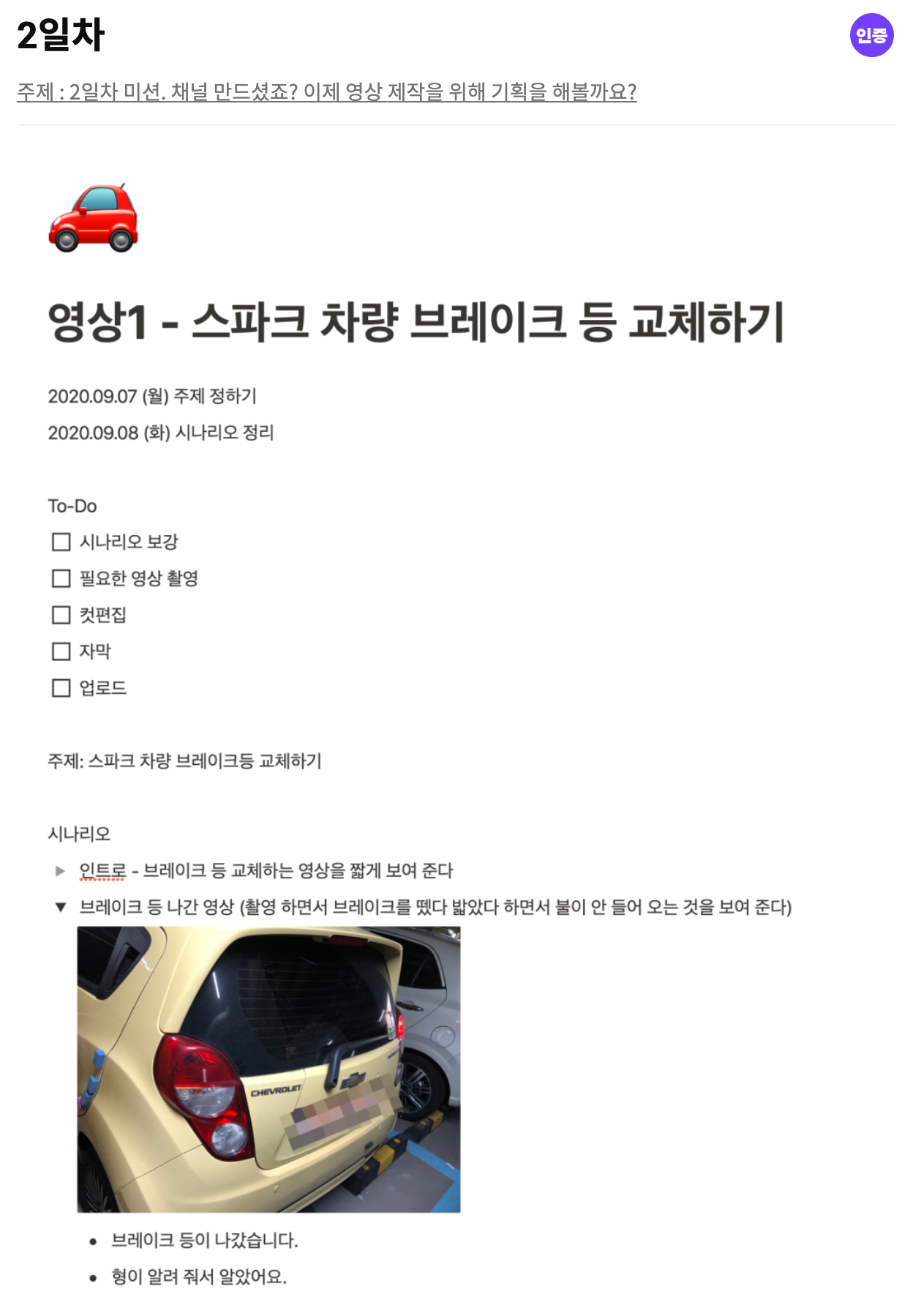 2일 차도 기획입니다. 이번에는 앞으로 할 일들과 상세 시나리오를 더 정리해 보았습니다. 이번에 제작해 볼 영상이 좀 더 구체적으로 그려졌습니다.