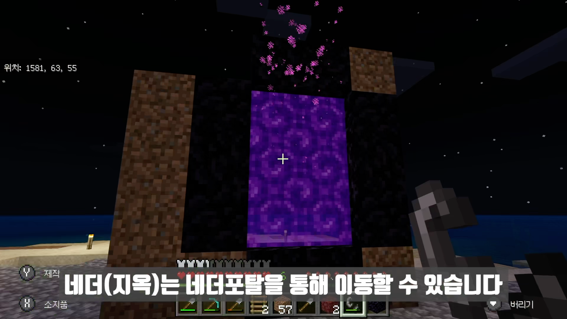 네더 차원문에 서 있으면 화면이 울렁거리면서 네더로 이동하게 됩니다. 이동 중에 공격받아서 벗어나게 되면 이동이 취소됩니다.
