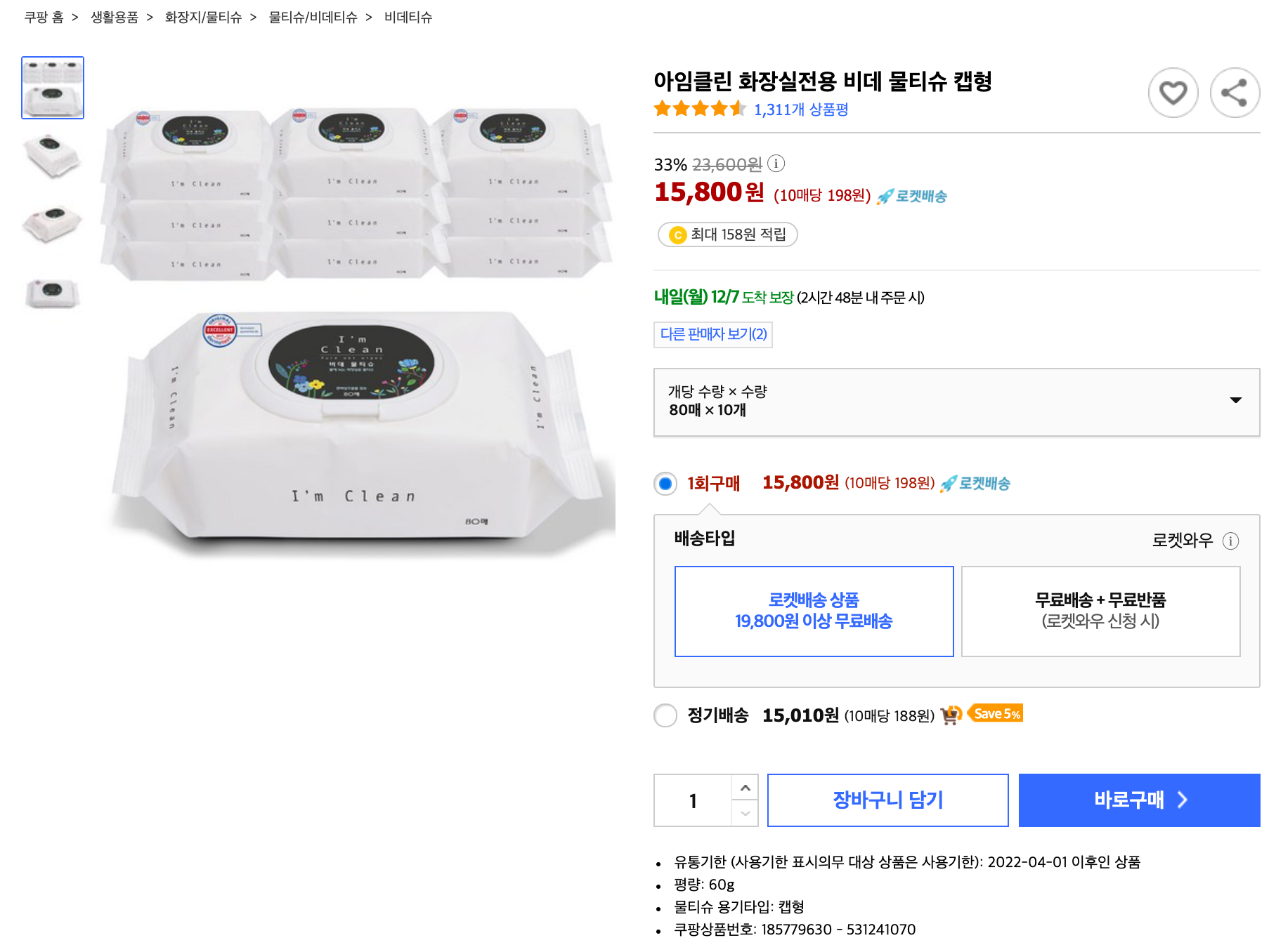아임클린 화장실전용 비데 물티슈 캡형
