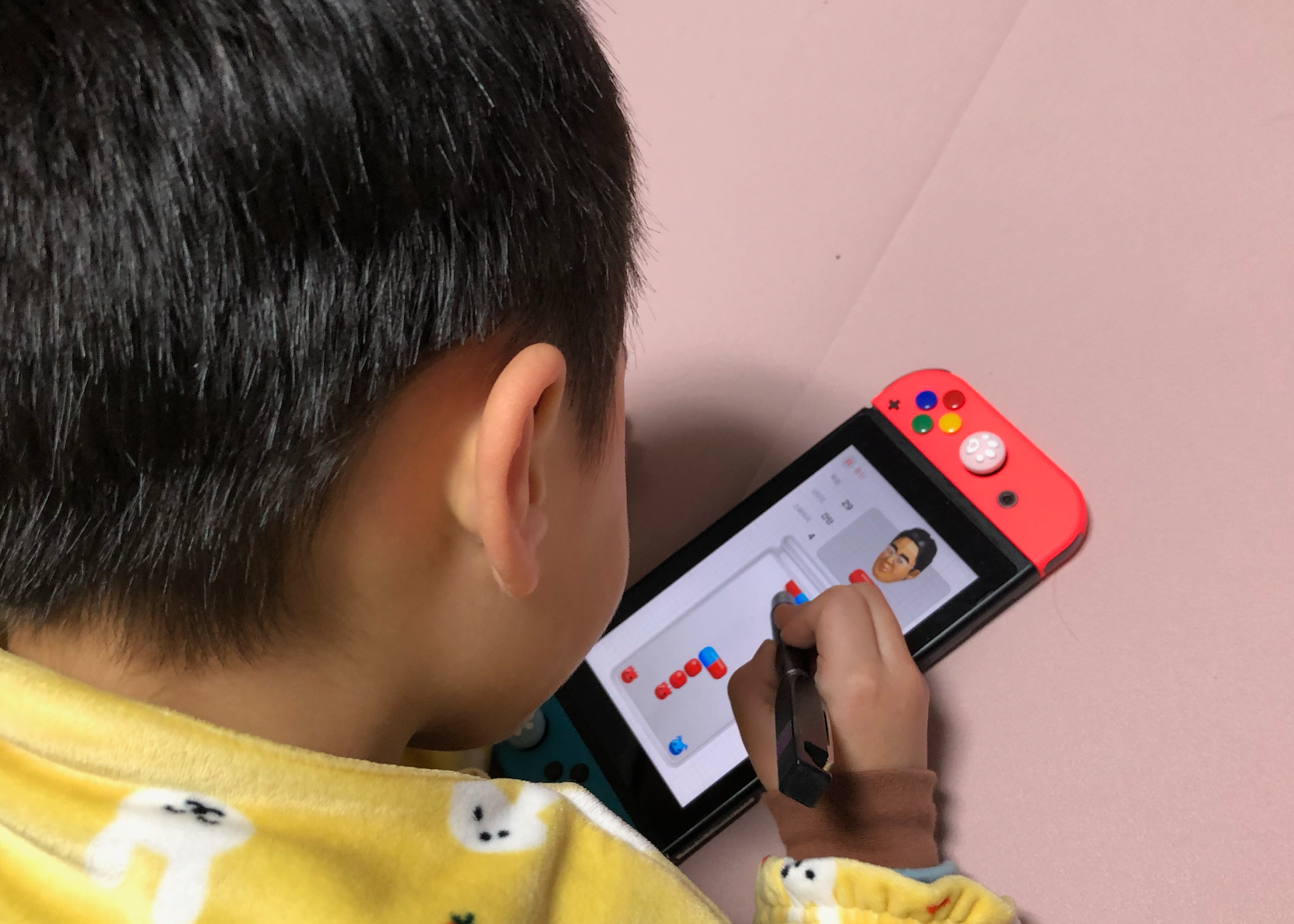 바이러스 퇴치 게임을 하는 둘째 아이입니다. 다이소 터치 펜으로 열심히 하고 있네요. 뿌요뿌요 비슷한 게임인데요. 이거 잘하게 되면 예전에는 하다가 어려워서 안 하는 뿌요뿌요랑 테트리스로도 넘어가 봐야겠습니다.
