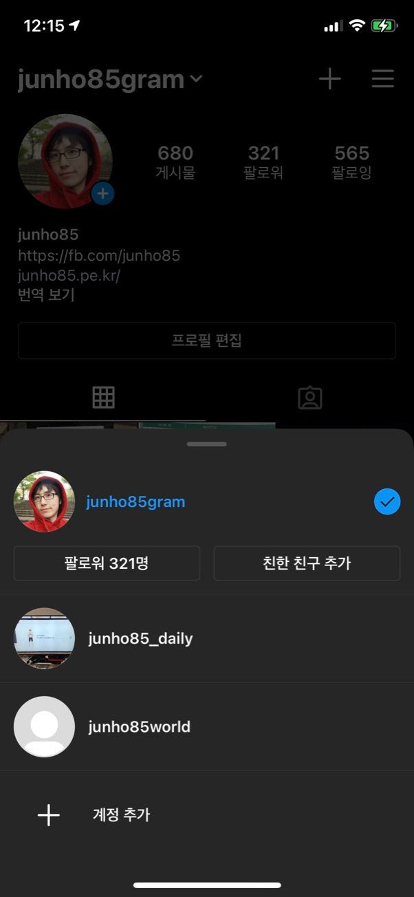 계정 전환을 하는 방법은 우측 하단에 보이는 프로필 사진을 더블 탭 하면 계정이 전환됩니다. 그런데 최근에 사용한 두 개의 계정 간으로만 전환됩니다. 만약 계정이 3개 이상이라면 화면 상단의 아이디를 탭 합니다.