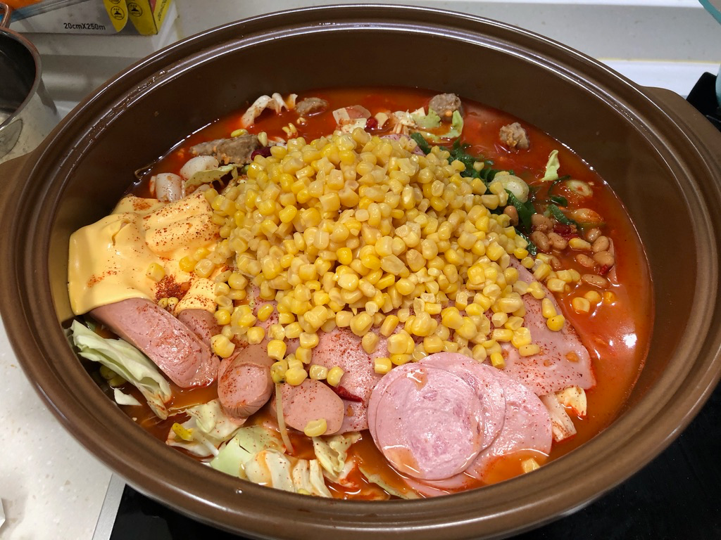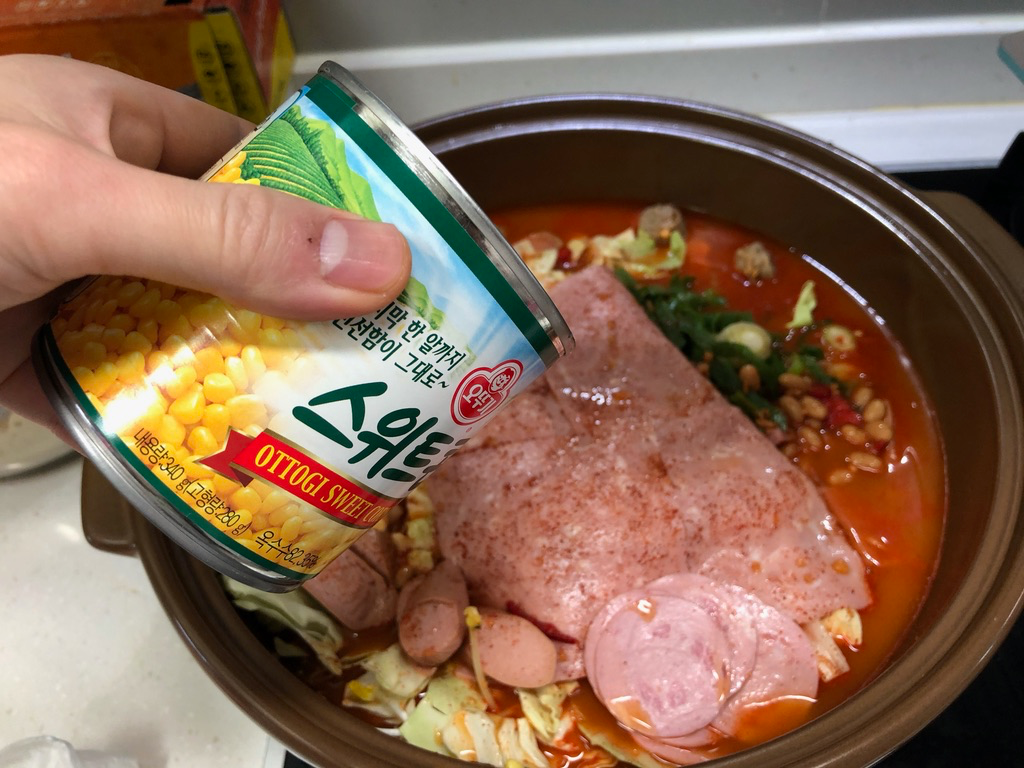 부대찌개에 스위트콘을 넣는 걸 잘 못 본 거 같긴 하는데요. 인터넷 검색해 보니 은근히 넣어 드시는 분들이 있긴 하더군요. 보통 한두 스푼 정도 넣는 거 같던데 귀찮으니 그냥 다 넣었습니다.