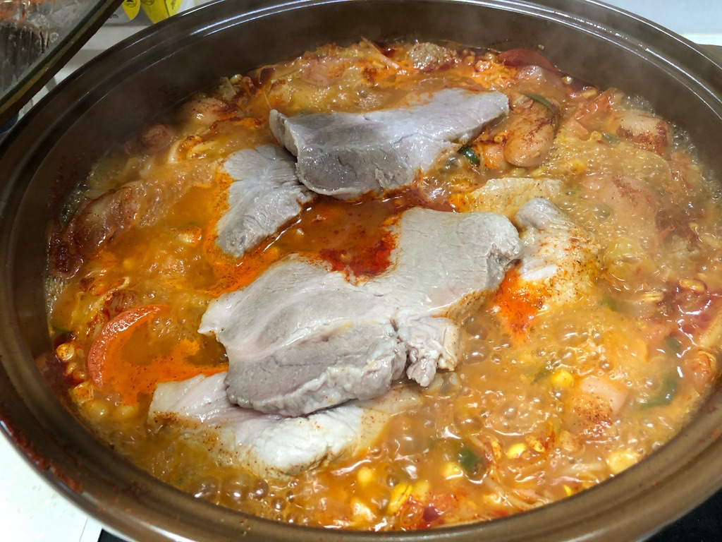 보글보글 끓기 시작합니다. 그런데 뭔가 좀 부족해 보입니다. 일단 개인적으로 부대찌개에 고기완 자랑 콩나물은 별로 제 취향은 아닌 거 같고요. 햄이랑 소시지가 좀 부족해 보입니다. 그런데 집에 부대찌개에 넣기 적당한 햄이나 소시지는 딱히 없었고 돼지고기 사 온 것이 있었습니다.