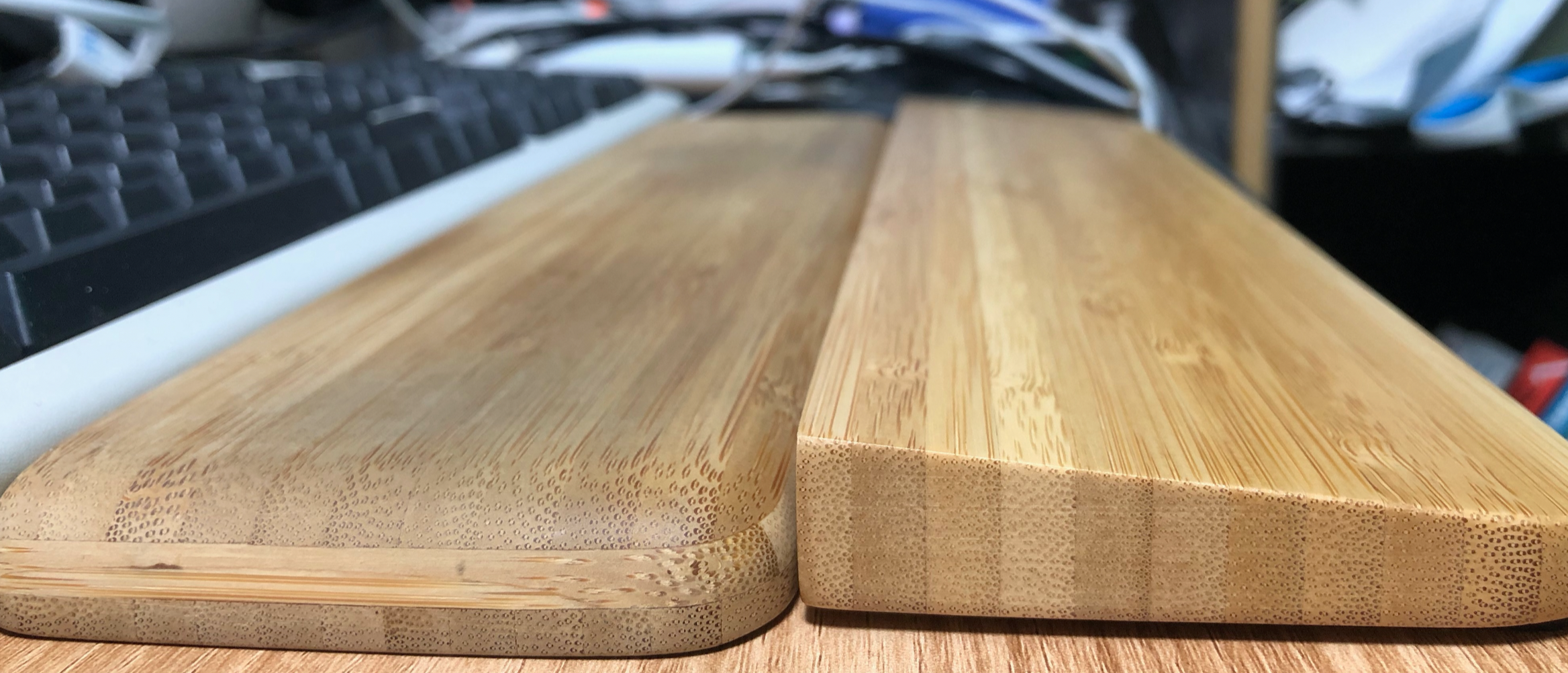 기존에 사용하던 키보드 손목 받침대와 옆모습 비교 사진입니다. 제닉스 제품이 높은 부분은 더 높고 낮은 부분은 더 낮습니다. 제닉스 제품은 경사가 좀 있는데 손목을 두기 딱 적당한 경사인 거 같습니다.