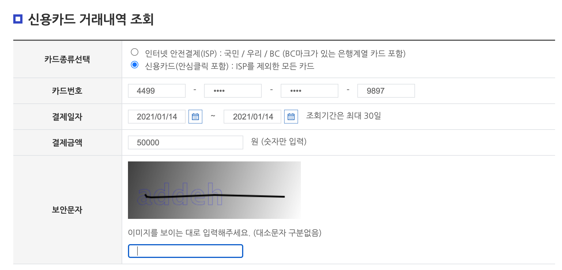 승인번호 8자리 숫자를 알려주면 좀 더 수월하게 확인이 가능하더군요. 승인번호를 모르면 날짜랑 금액 등의 정보로 확인은 가능한 거 같습니다.