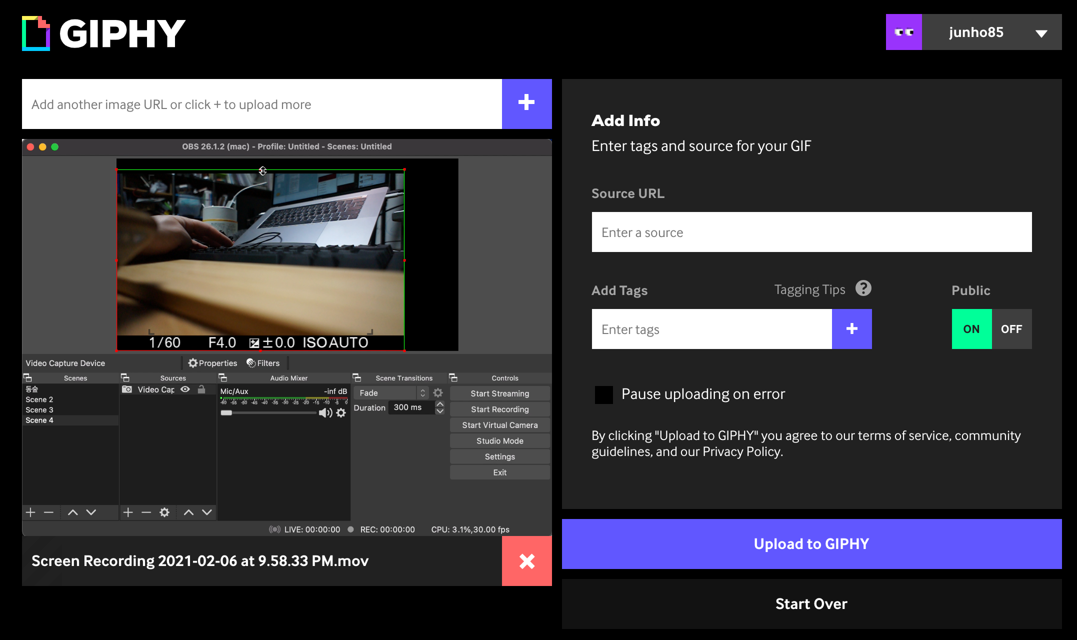 Upload to GIPHY를 누르면 파일 업로드 및 변환이 진행됩니다.