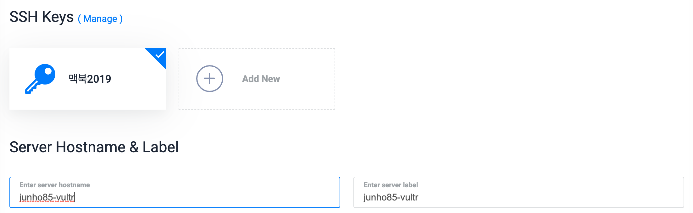 SSH Keys도 미리 설정을 할 수 있어서 편리하네요. 호스트 이름도 적당히 지정해 줍니다.