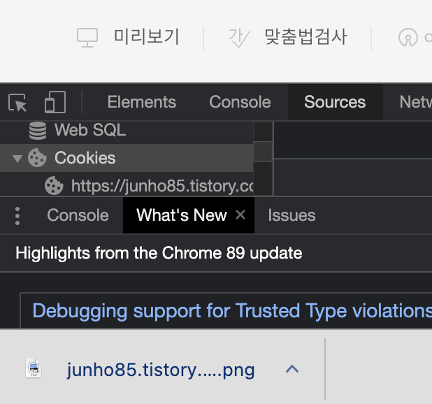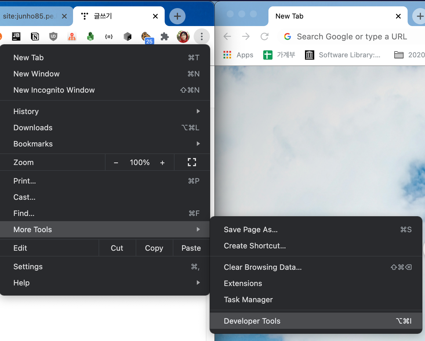다만 개발자 도구를 사용해야 합니다. 우측 상단의 more (점 3개) 버튼을 누르고 More Tools -> Developer Tools를 선택합니다.