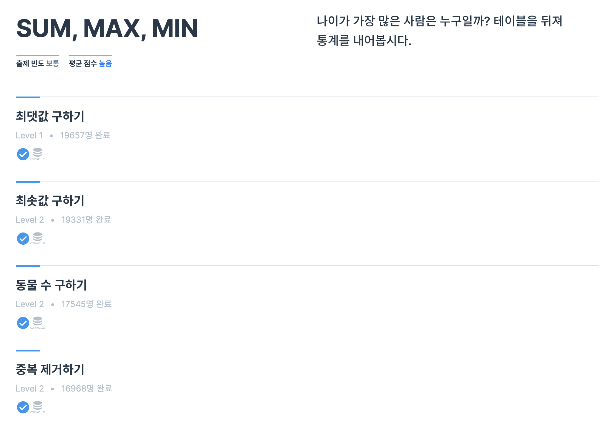 SELECT 문제 풀기 다음으로 SUM, MAX, MIN 문제들을 풀어봅니다.