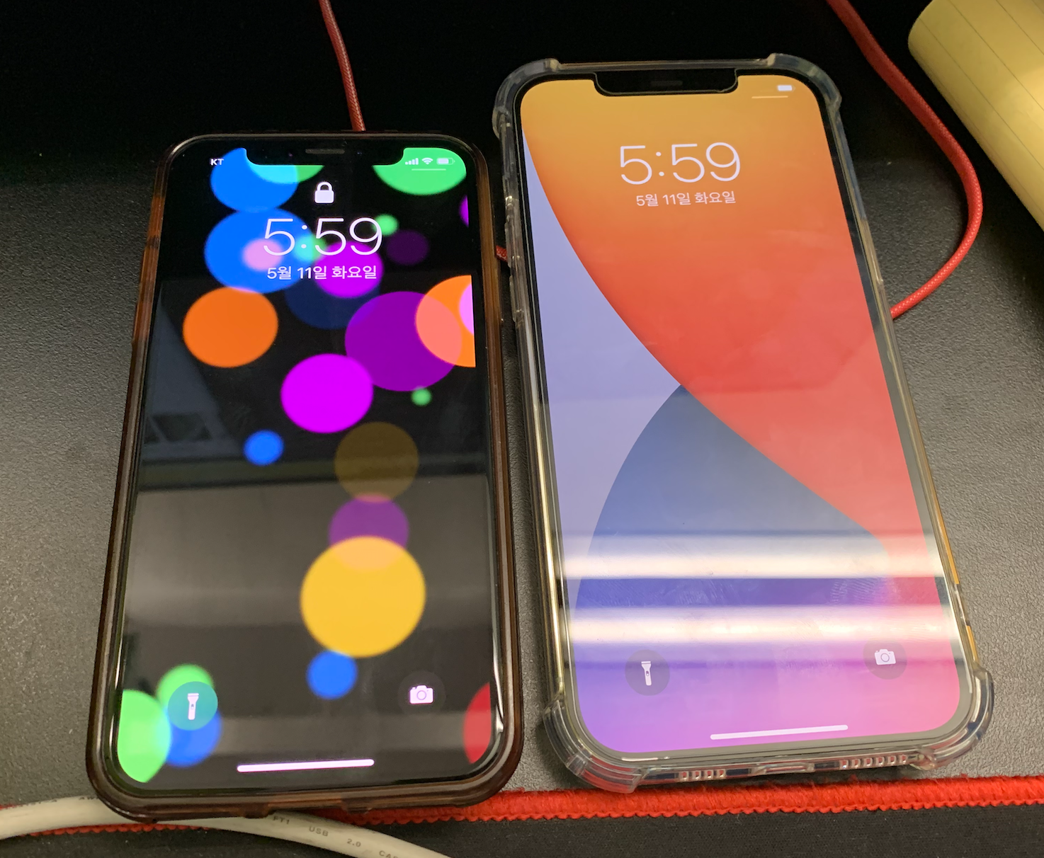 기존 아이폰 X와 이번에 구입한 12 Pro Max입니다. 아이폰 X 처음 쓸 때도 사이즈가 크다고 생각했었는데 Max는 더 큽니다. 앞으로 더 큰 사이즈가 나올지 어떨지 궁금하네요. 이제 더 커지면 주머니에도 안 들어가는 거 아닌가 싶기도 합니다.
