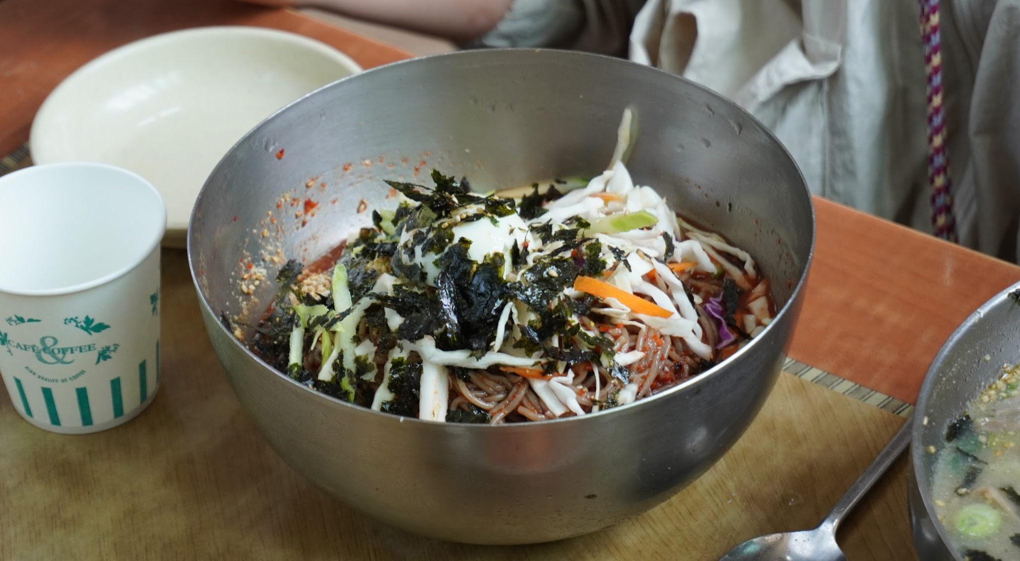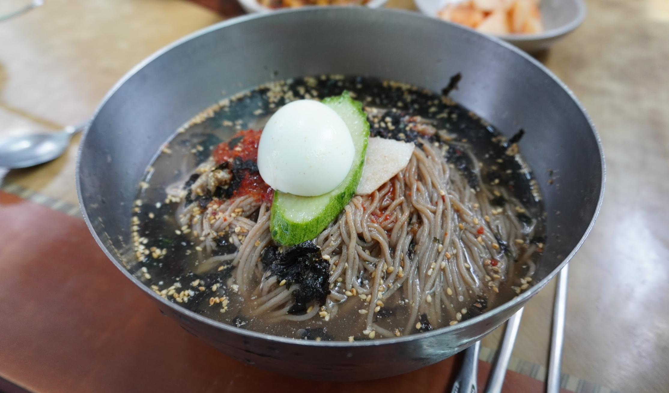 물막국수입니다. 제가 먹은 건데요. 처음 먹으면 뭔가 별 맛 안 나는 맛인데 먹을수록 점점 더 맛있더군요. 먹다가 식초, 설탕, 겨자소스도 뿌려 먹었는데 조합에 따라 맛이 달라집니다. 어떤 조합이 가장 맛있을지는 여러 번 먹어보며 감을 잡아야 될 거 같네요.