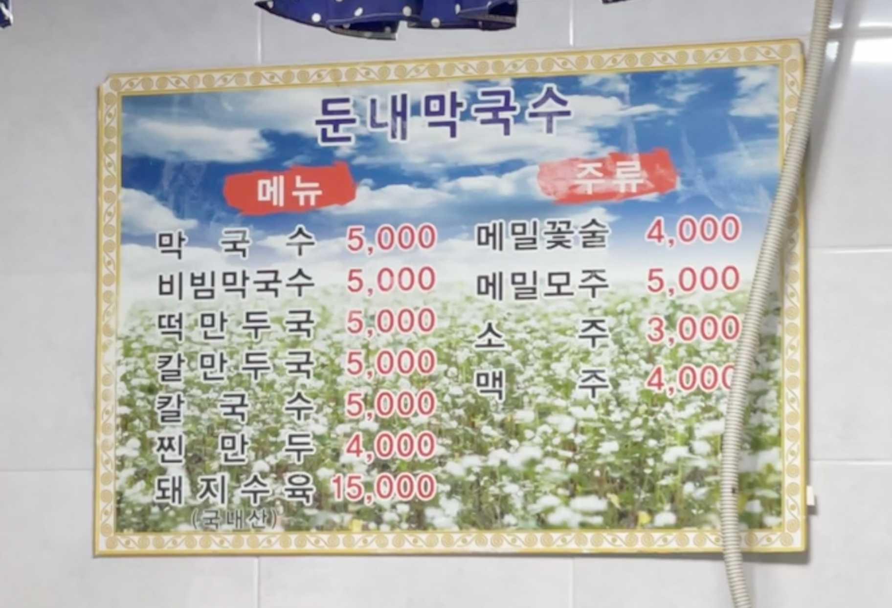 막국수, 비빔막국수, 떡만둣국, 칼 만둣국, 칼국수가 모두 5천 원입니다. 요즘은 웬만하면 간단한 식사도 6천 원이 넘는 편인데 여기는 가격이 참 저렴합니다.
