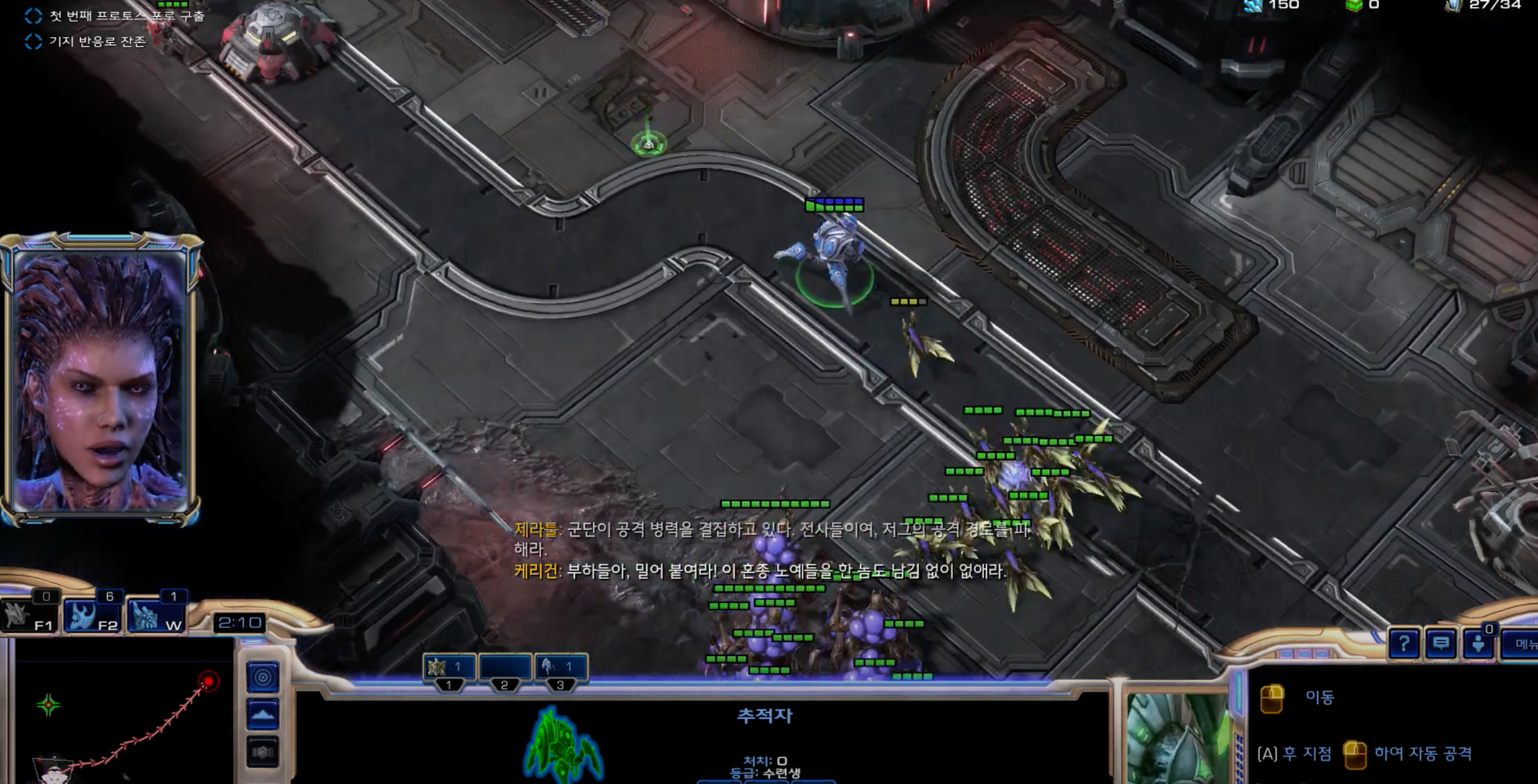 추적자를 이용해서 저그 군단을 유인해서 뫼비우스 재단 테란 병력을 처리하는 것이 좋습니다.