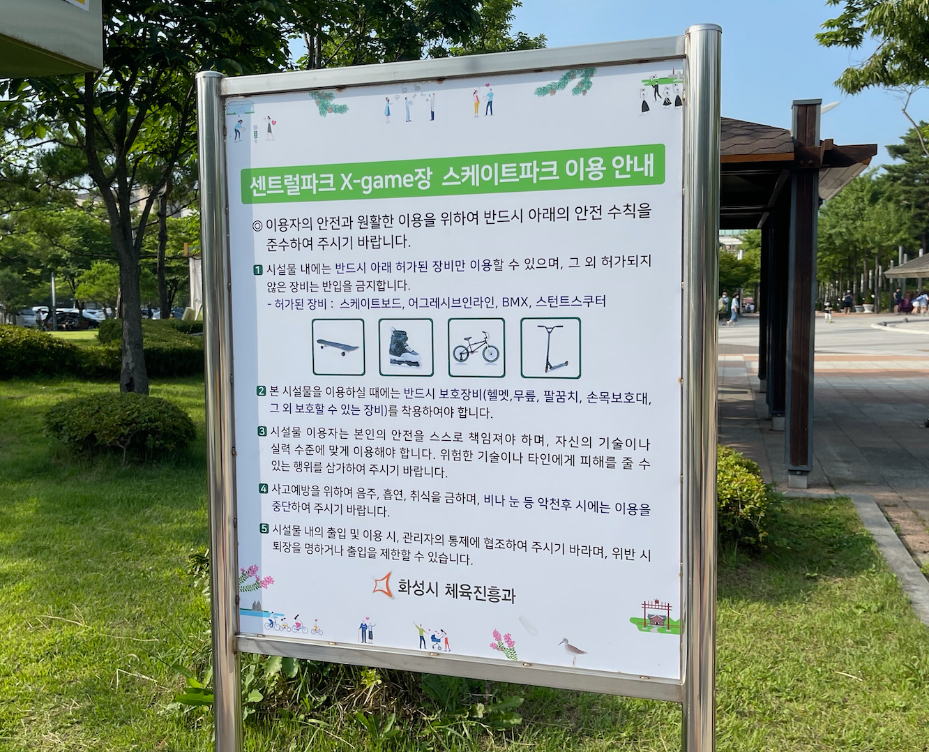 X게임장은 허가된 장비만 사용할 수 있습니다. 스케이트보드, 어그레시브 인라인, BMX, 스턴트 스쿠터입니다. 저도 언젠가 한번 즈음 X게임을 해 보고 싶긴 하지만 아직은 인라인스케이트도 초보라서 인라인스케이트 먼저 좀 연습해 보려 합니다.