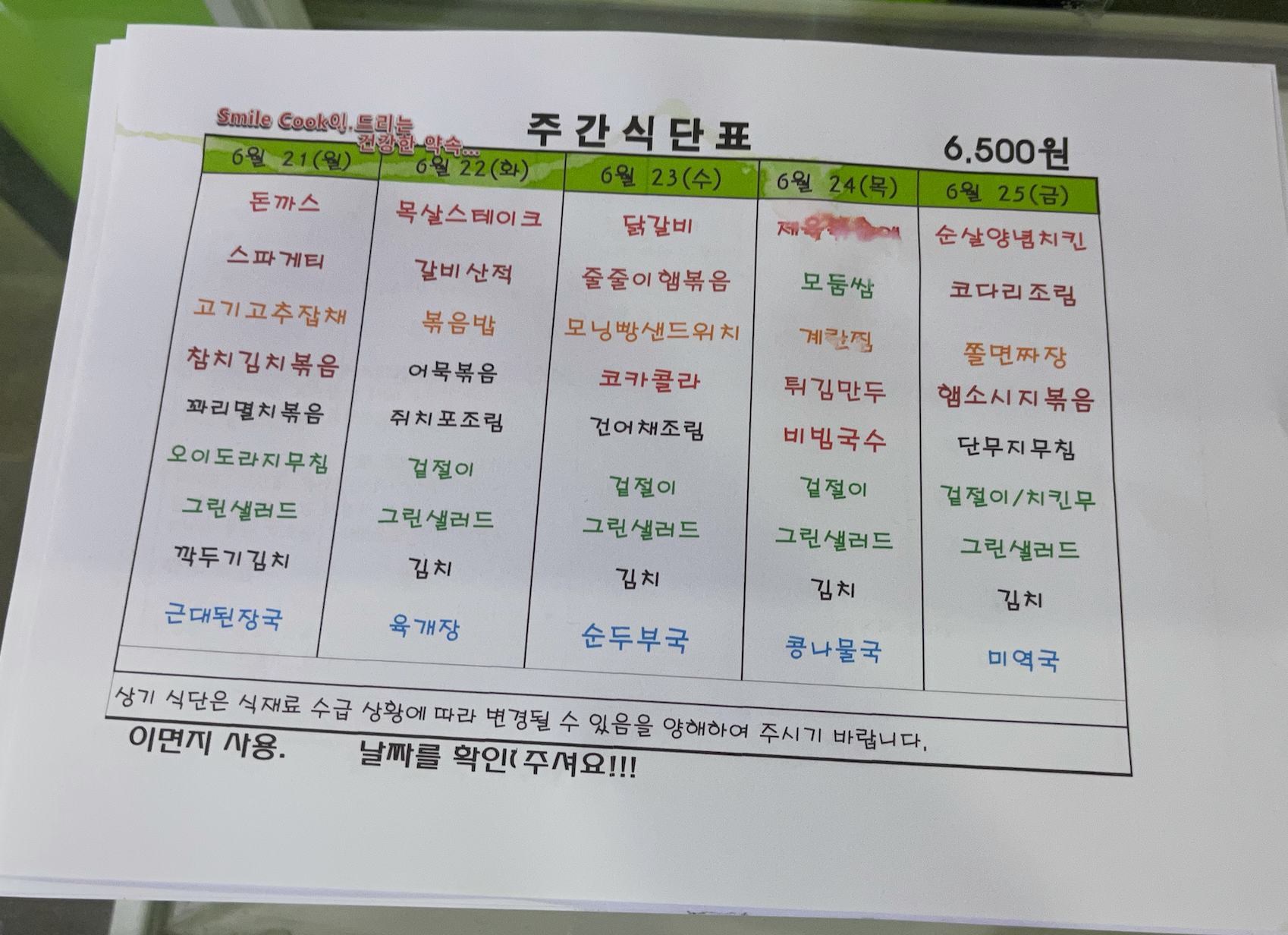 사진을 찍어가서 보라고도 안내가 되어 있어서 매주 처음 식당을 찾을 때면 이렇게 식단을 촬영해 두곤 합니다. 매주 식단은 비슷비슷하게 변하는 편입니다. 조금씩 차이가 있긴 하지만 크게 변하지는 않기 때문에 자주 가다 보면 어느 정도 식단이 예상되는 편입니다.
