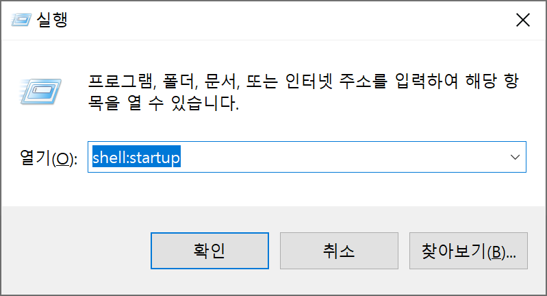 Win + R 키를 누르면 실행창이 뜨는데요. "shell:startup"을 입력하고 실행시킵니다.