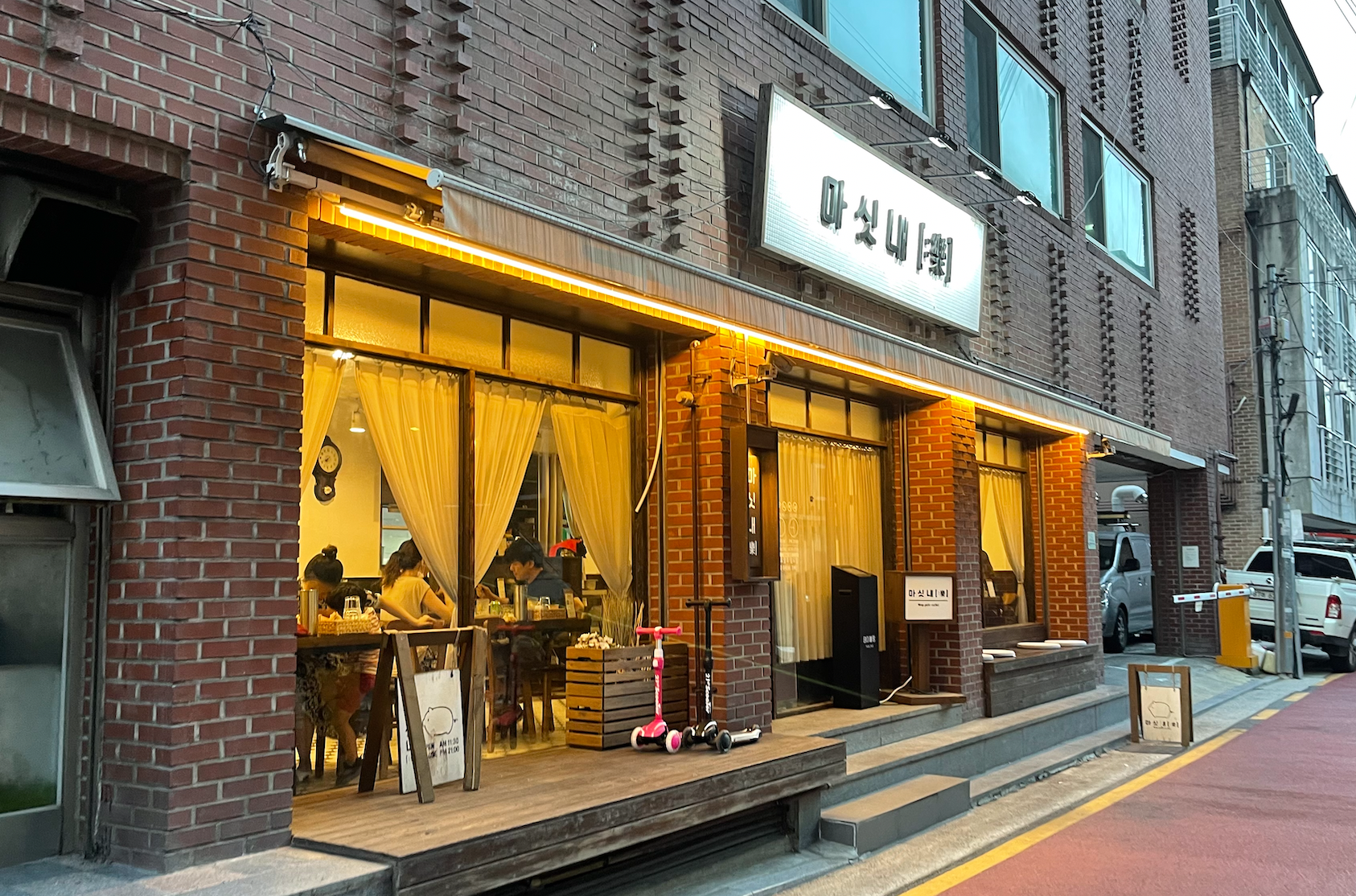 조명이 은은하게 빛나고 있고 아담하게 잘 꾸며둔 가게가 보입니다.