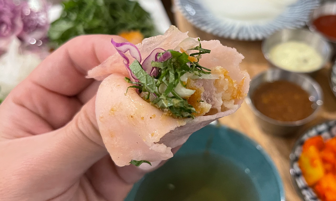 밀전병에 야채, 소스, 돈가스를 싸서 먹는 모습입니다.