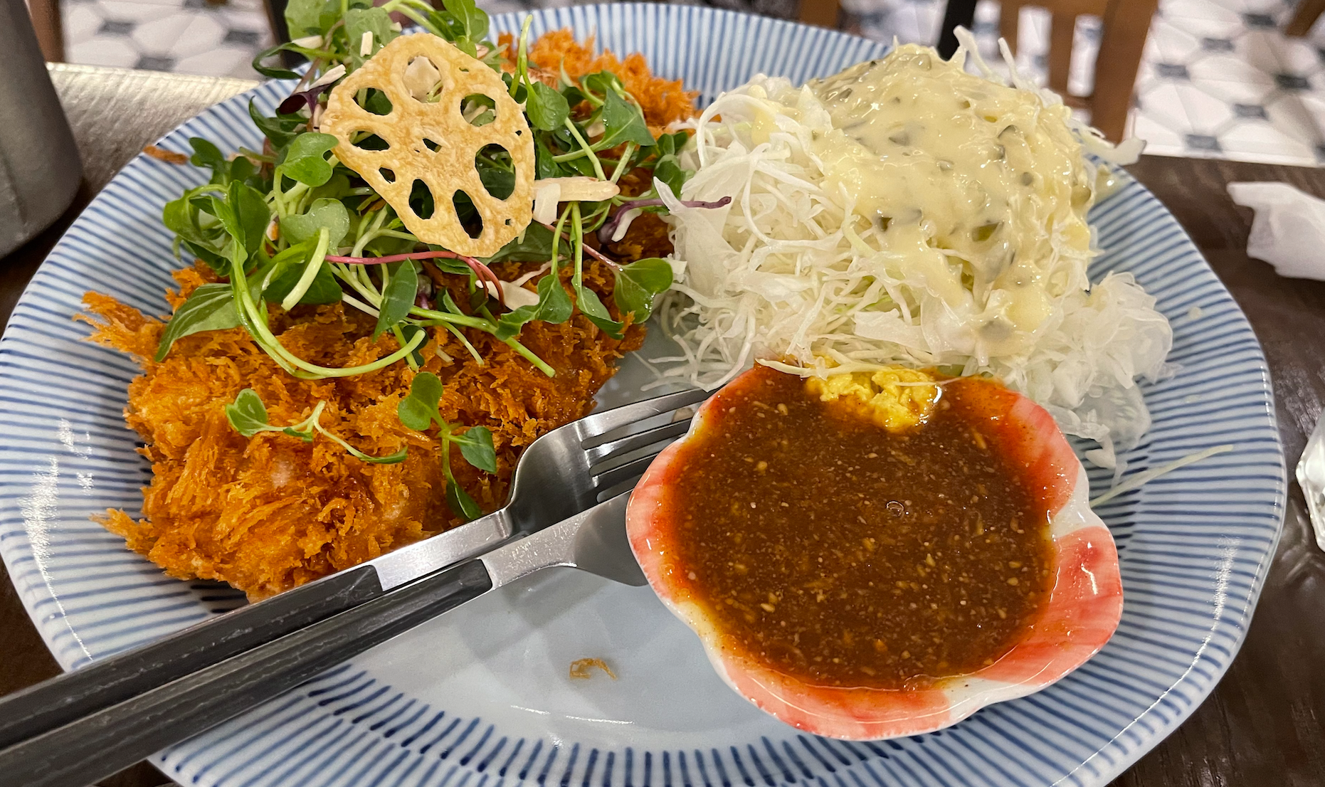 마싯내 돈가스는 "쫀득한 밀전병에 야채를 싸 먹는 돈가스"라고 적혀있습니다. 밀전병에 싸 먹는다니 상상이 안 갔습니다.