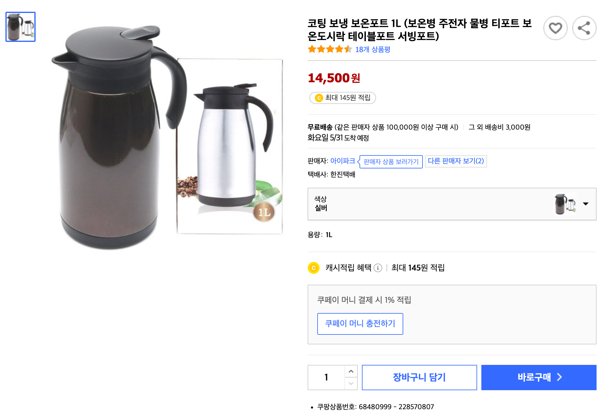 예전에는 빨간색이 들어간 주전자였는데 마음에 들어서 집에서도 사서 썼던 적이 있습니다. 빨간색 주전자가 고장 나서 새로 살까 했는데 요즘은 안 나오더군요. 그래서인지 식당에서 사용하는 주전자도 바뀌었네요. 아래 제품인 거 같습니다. 오랜만에 주전자나 바꿔 볼까 생각도 드네요.