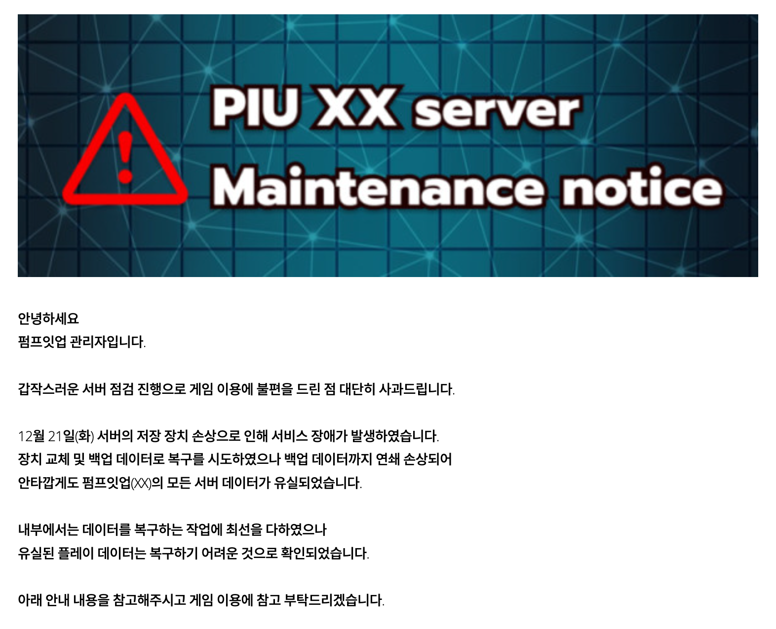 2021년 12월 29일 공지를 보니 서버의 저장 장치 손상으로 데이터가 다 날아가 버렸다고 하네요.