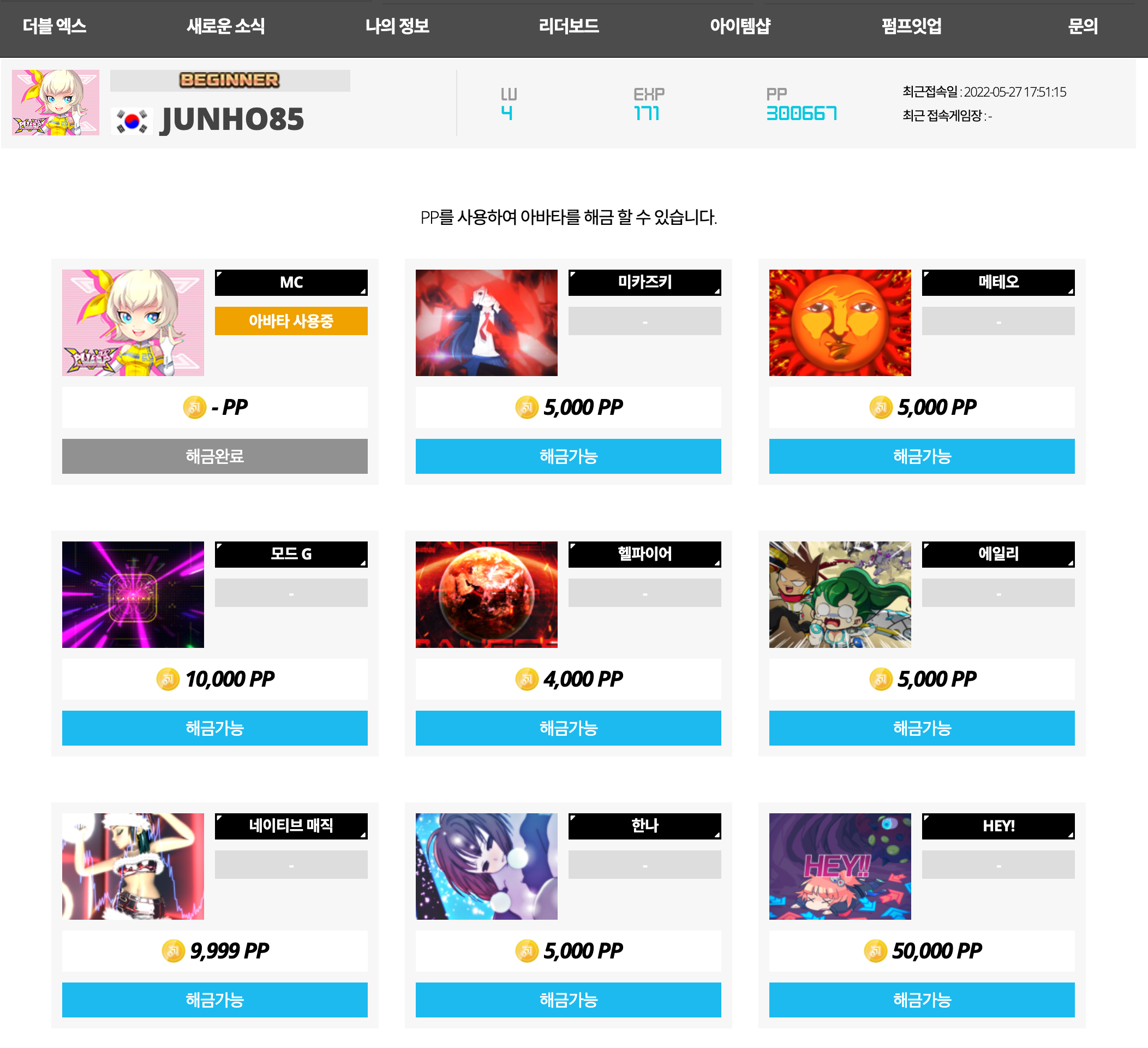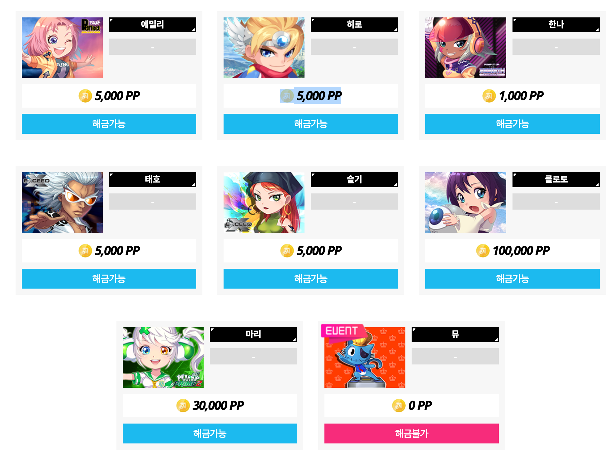 마음에 드는 아바타를 찾기가 쉽지 않네요. 아래쪽에 있는 5000PP 짜리 "히로"가 그나마 무난해 보입니다.