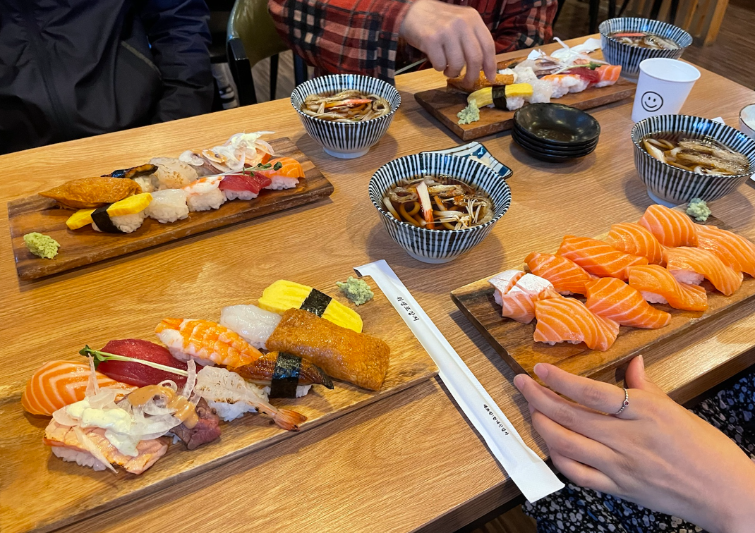 연어 초밥 세트도 시켰는데 연어가 큼직큼직한 것이 느껴집니다. 미니우동도 각자 하나씩 시켰는데 미니우동은 하나에 천 원입니다.