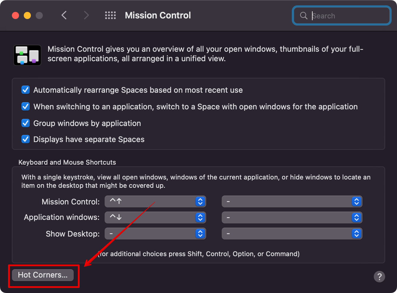 핫코너 설정을 하려면 System Preferences > Mission Control에 들어가 보면 좌측 하단에 "Hot Corners..."라는 버튼이 있고 여기서 할 수 있습니다. (참고로 System Preferences > Desktop & Screen Saver 우측 하단에도 "Hot Corners..."버튼이 있어 여기서도 같은 설정을 할 수 있습니다.)