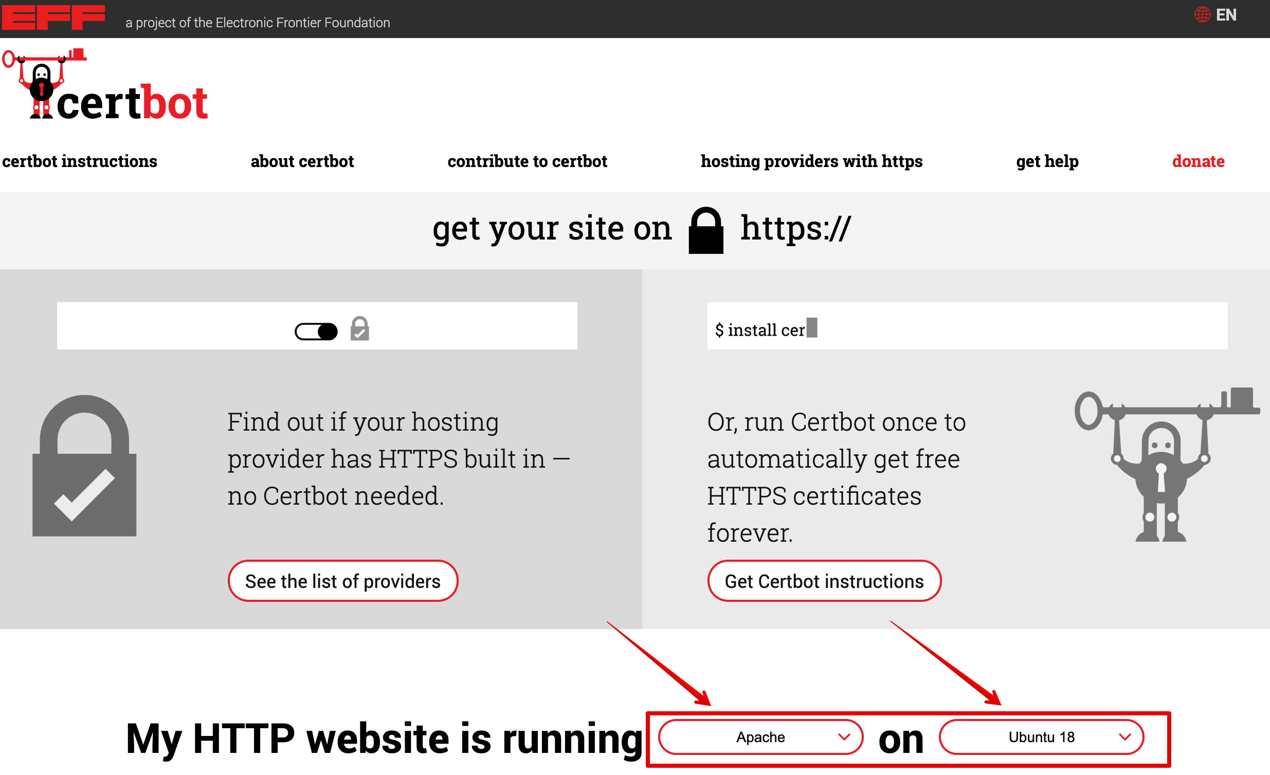 Certbot 사이트 주소는 https://certbot.eff.org/이고 아래는 Certbot사이트에 접속한 모습입니다. 아래쪽에 보면 서버 애플리케이션 (e.g. Apache, Nginx 등)와 OS (Ubuntu, macOS 등)을 선택하는 부분이 보입니다. 저는 Apache와 Ubuntu 18을 선택했습니다.