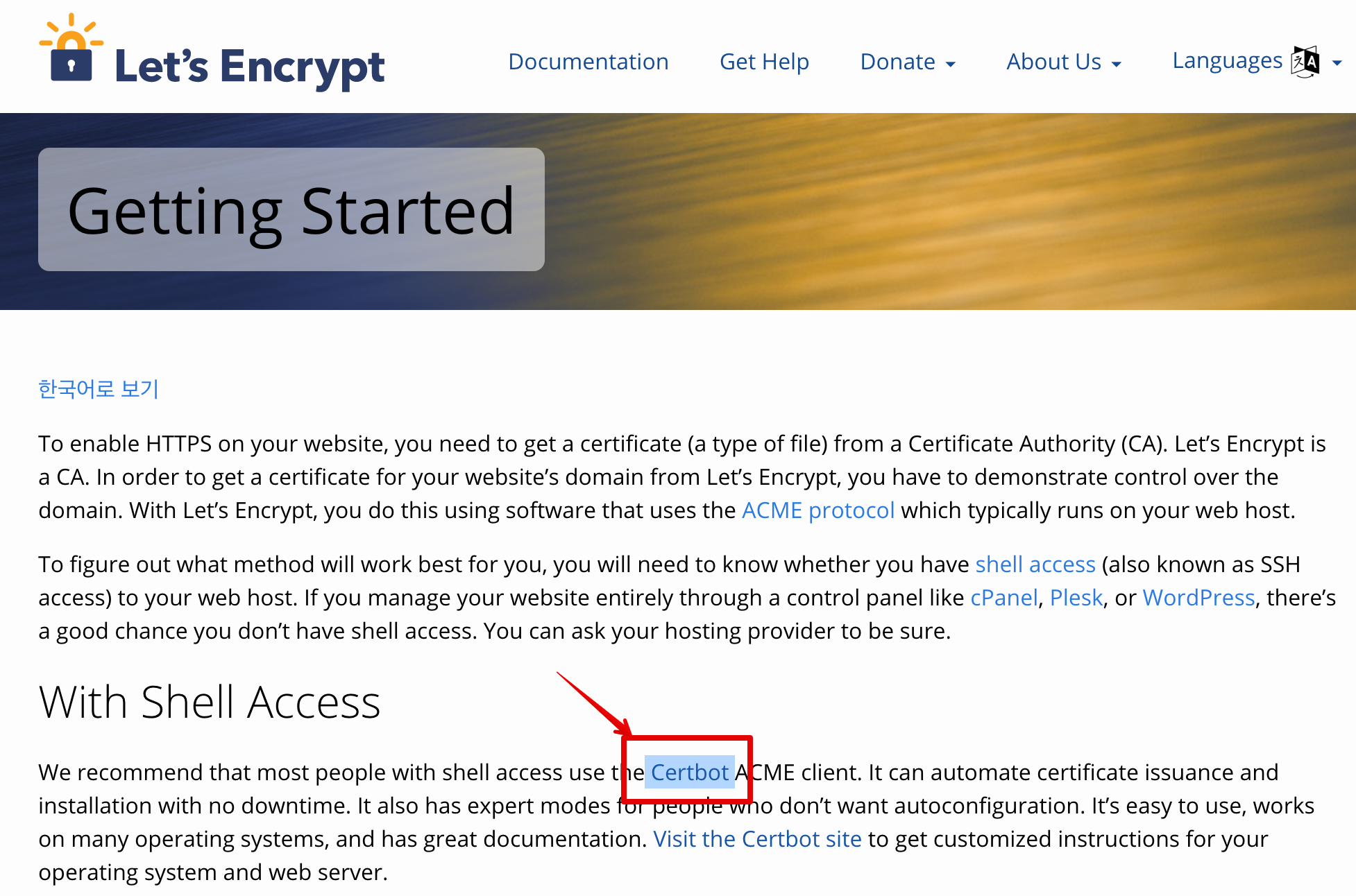 여러 설명이 나와있는데 아무튼 Certbot을 이용하기를 권장한다고 합니다. 자동으로 인증서를 발급받고 설치까지 해준다고 합니다.