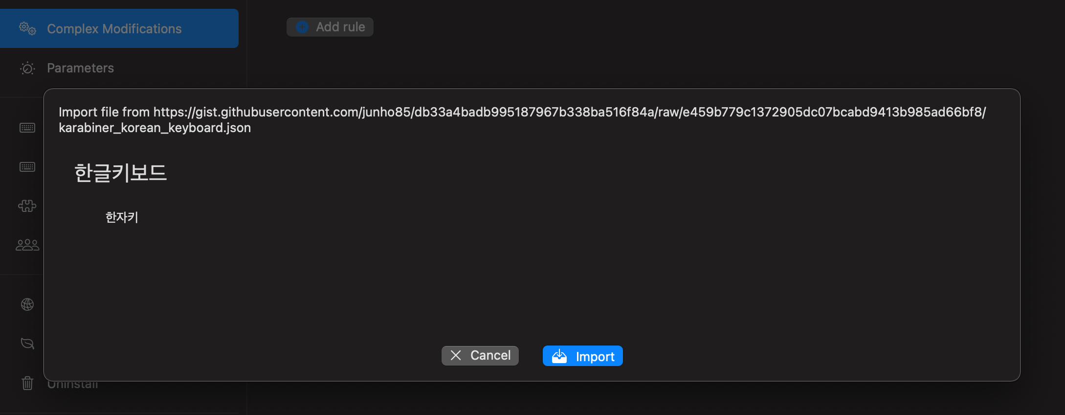 Karabiner-Elements에 Complex Modifications에 룰을 Import 하는 화면이 나타납니다.