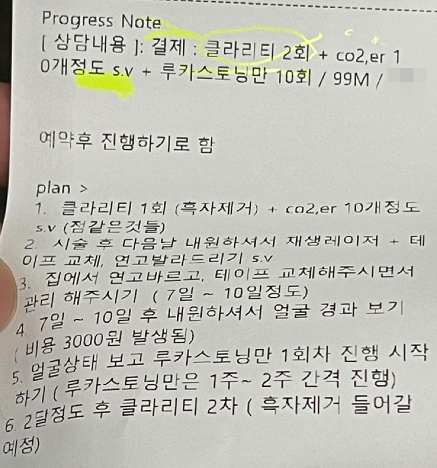 기본 치료가 50만 원인 거도 후들후들한데 루카스 토닝이 1회 4만 원에 10회 해서 40만 원 해서 총 90만 원이라고 합니다. 그런데 부가세 포함하면 99만 원이라고 하네요. 이거도 뭔가 할인한 가격이라고 합니다. 저 같은 초보자는 헉하는 금액이었지만 저보다는 전문가인 아내에게 물어보니 보통 그렇게 한다고 하네요. 루카스 토닝도 5회 하고 추가로 5회 해도 된다고는 하는데 그렇게 되면 할인 금액이 적용되지 않아서 16만 원 정도 더 들 거 같았습니다. 그냥 10회 끊었습니다. 조금 호갱이 된 거 같은 느낌도 들지만 왜인지 해보고 싶었던 거 같습니다. 아내도 해보라고 그러고요. 웬만해서는 병원 다니기 싫어했던 저도 나이가 들고 병원에 맛들이 다 보니 관성이 생겨버린 걸까요? 그러고 보면 작년부터 참 여러 가지 치료를 받아보고 있는 거 같습니다.
