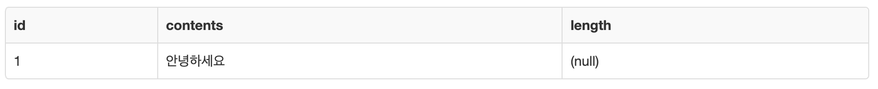 INSERT INTO articles (id, length, contents) VALUES (1, char_length(contents), '안녕하세요');