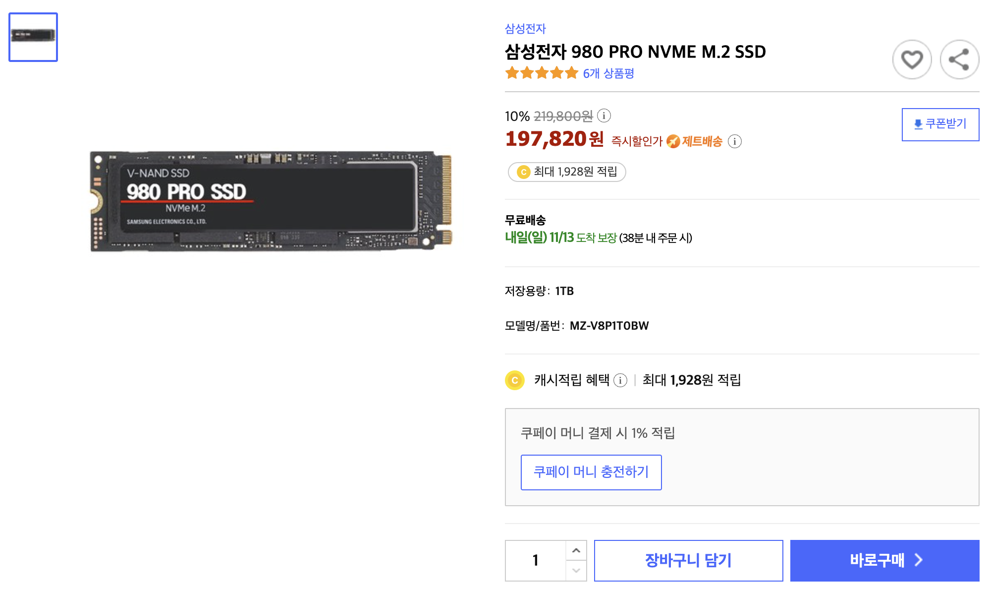 성능을 개선하려면 여기서 4만 원 정도 더 투자해서 980 PRO를 구입하는 방법도 있을 거 같습니다.